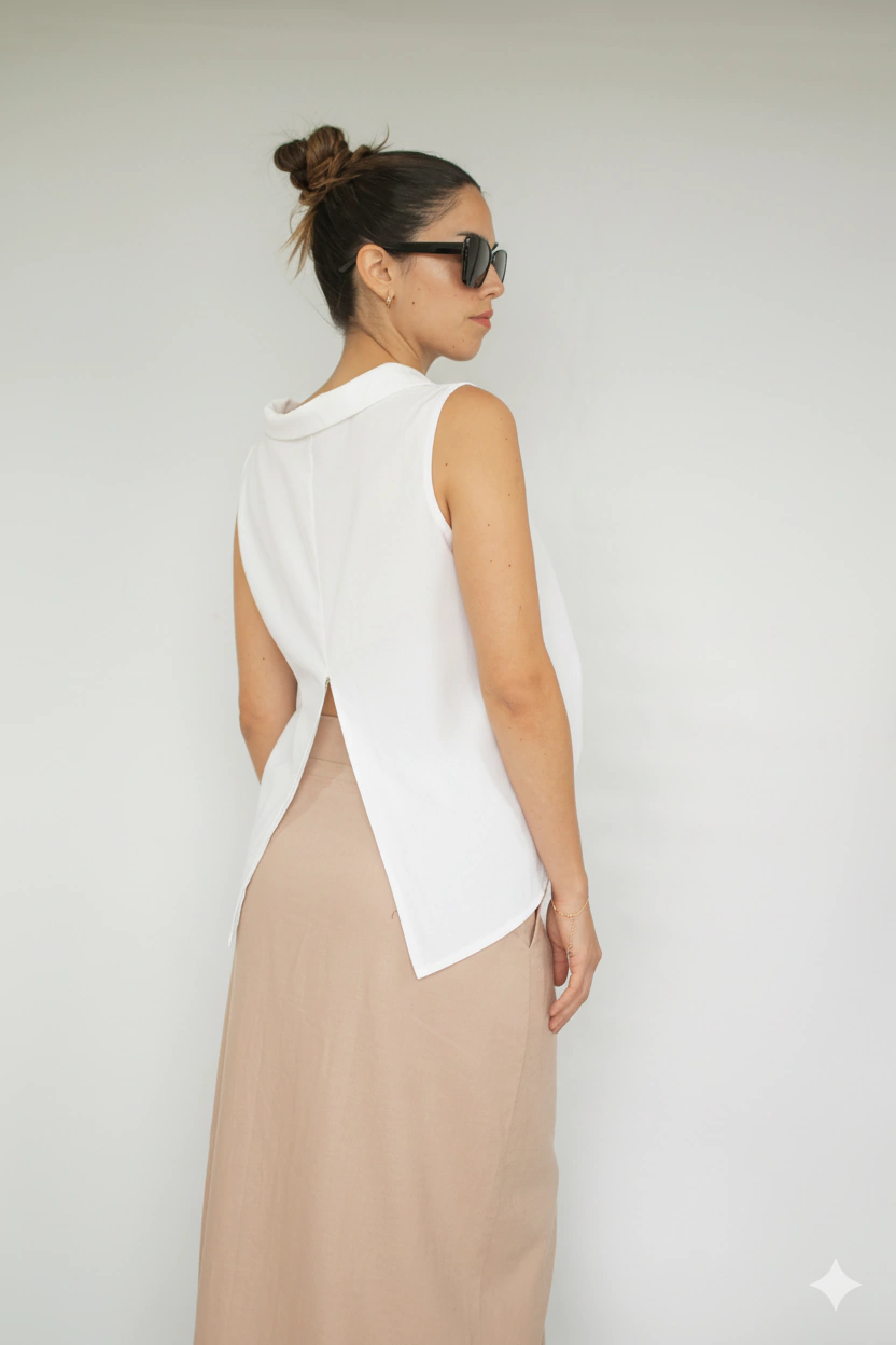 La blusa Cleo combina líneas puras y una silueta relajada con un detalle trasero que marca la diferencia: una abertura cruzada que aporta movimiento, frescura y un toque sutil de sensualidad.