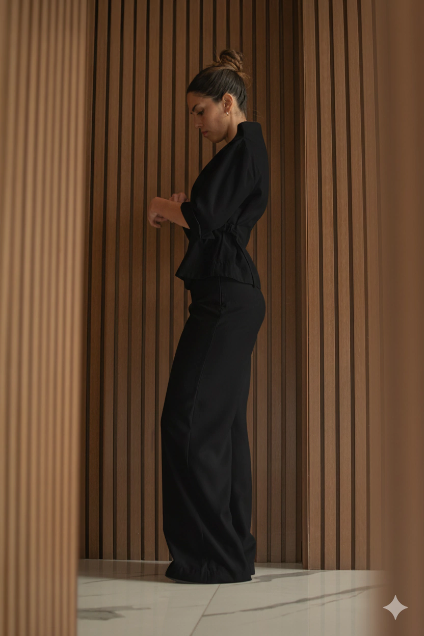 La blusa Rhea redefine la elegancia contemporánea con una silueta estructurada y femenina. Confeccionada en sastrera Lena, una tela de caída fluida y textura suave, equilibra confort y sofisticación. Su cuello amplio tipo funnel aporta carácter, mientras los pliegues laterales ajustables con hebillas metálicas permiten realzar la figura con sutileza. Las mangas tres cuartos con terminación doblada completan un diseño pensado para acompañar movimientos con naturalidad.